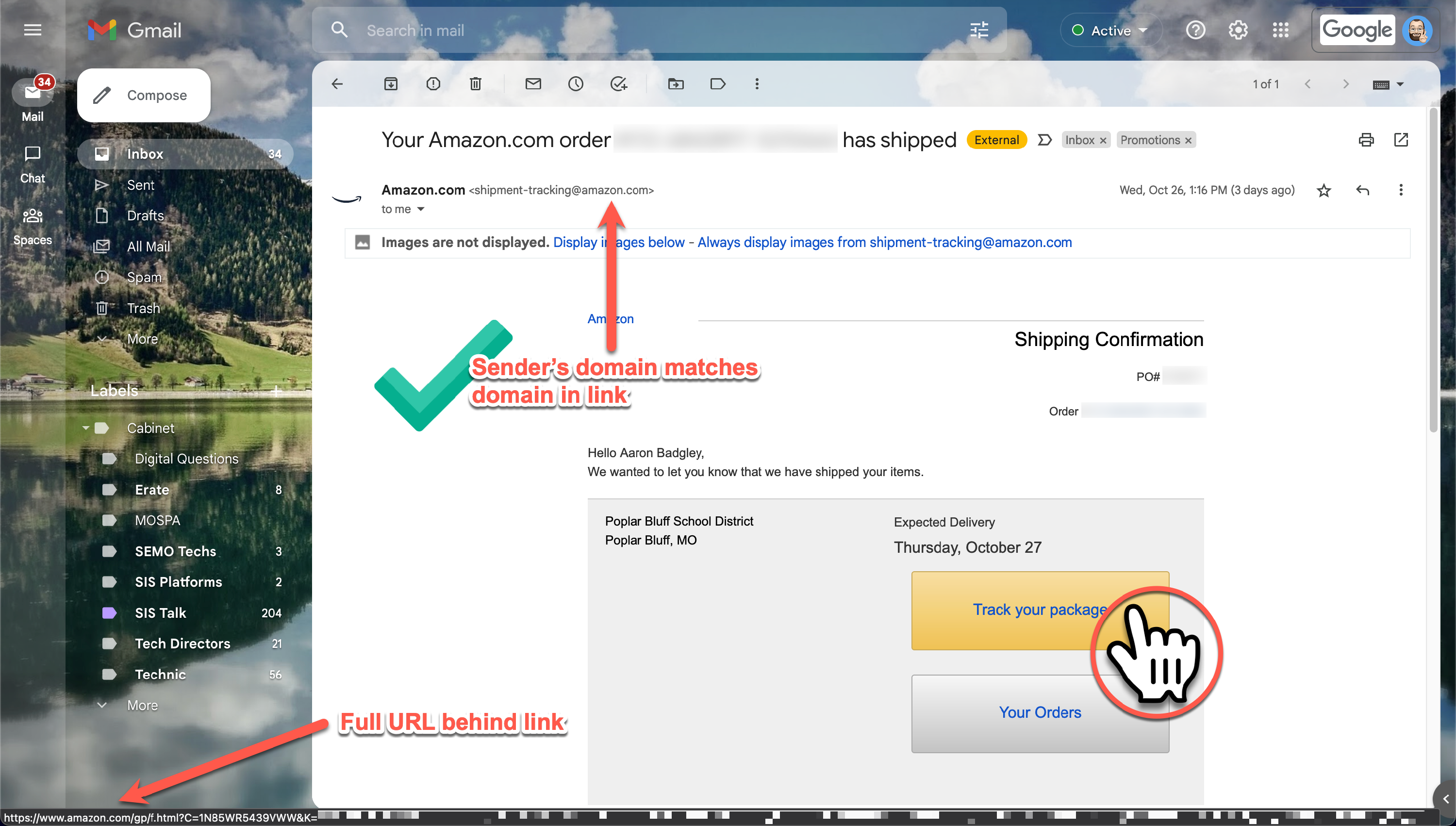 - Review the URL hiding behind the links. If you hover over a link or button, most browsers will show the URL behind that link at the bottom of the screen. Does the URL at the bottom of your browser match the sender's domain? If you were looking at an email from Amazon but hovering over a link in the email reveals an address like http://www[dot]malware[dot]com, then you probably aren't looking at a message from Amazon.