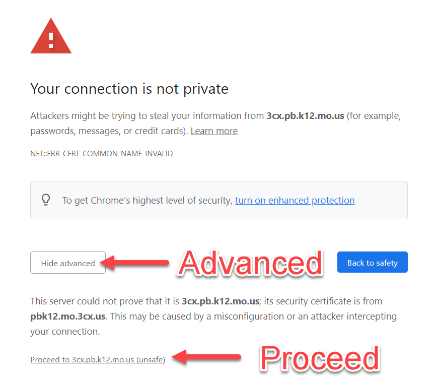 Note: At school, you may see the warning message below. You'll want to click the Advanced button and then Proceed on this screen. You'll only see this message inside the district network - you should not see this message at home or while traveling.