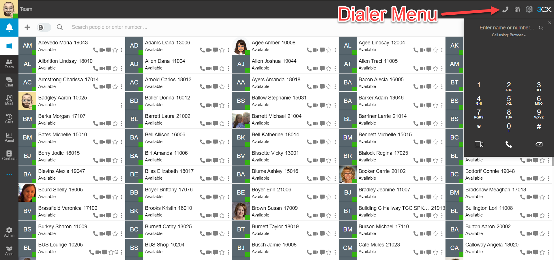 From the 3CX web client, you can make and receive calls by clicking on the phone icon next to the contact or through the Dialer Menu highlighted below. Note the drop-down menu on the Dialer Menu that says "Call using:" - this option will allow you to place a call entirely within your web browser using your microphone and speakers or transfer the call over to your desktop phone.