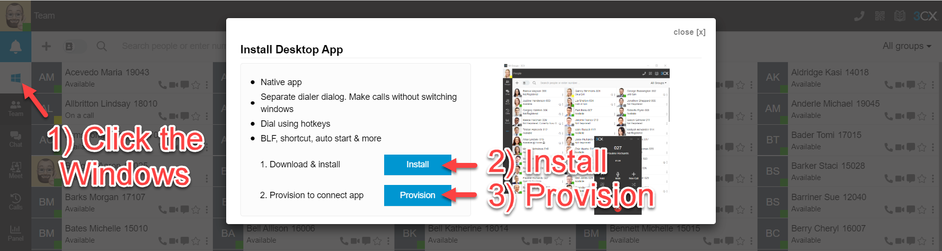 While logged into the 3CX web application, you can install a native desktop application for Windows or Mac. The desktop app has all of the functionality of the web-based version, but the desktop app might be more convenient to keep minimized and running in the background on your computer.