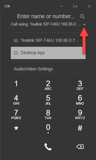 You can make and receive phone calls from the dialer window just as you would from your desk phone. Note the drop-down arrow pictured below - this option will allow you to choose between making the call in the app and transferring it to your desk phone or making a call entirely within the app using the microphone and speakers on your computer.