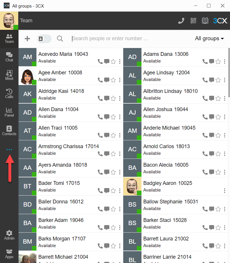 From the 3CX window, you can quickly make calls to internal contacts, chat, see your call history, and check your voicemail. Note the red arrow pictured below - this button will show you additional options on the left side menu.