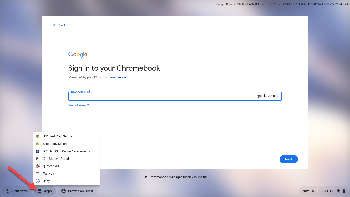 To access Kite, you must completely log out of the Chromebook and return to the initial login screen. Once logged out, you will see a menu button on the bottom left corner of the screen called Apps. This is where you will find secure testing platforms on Chromebooks.
