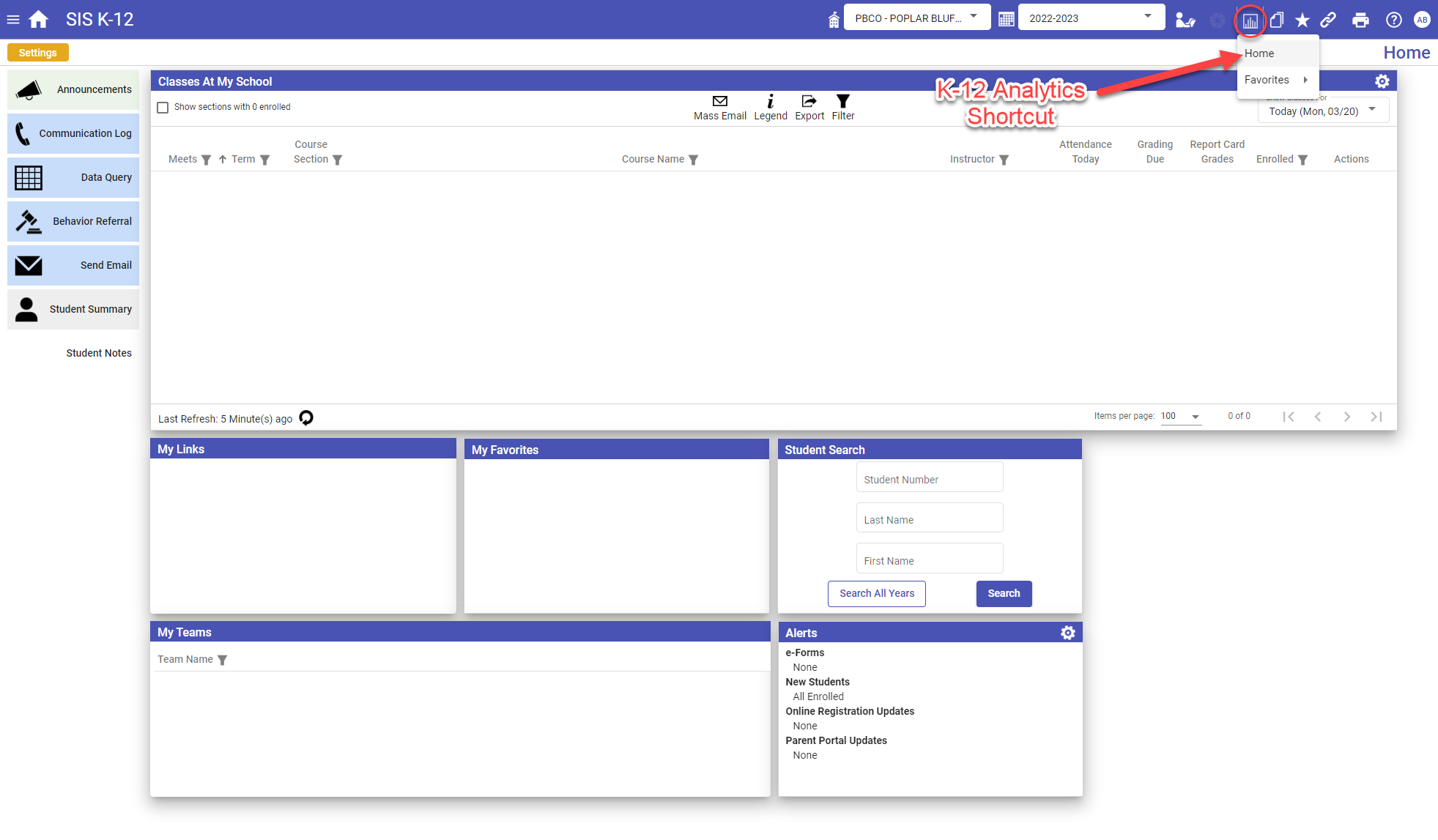 From the SIS 360 Home Screen, click the K-12 Analytics shortcut from the top right menu and then select Home from the drop-down list. K-12 Analytics will automatically sign you in without using an additional username and password.