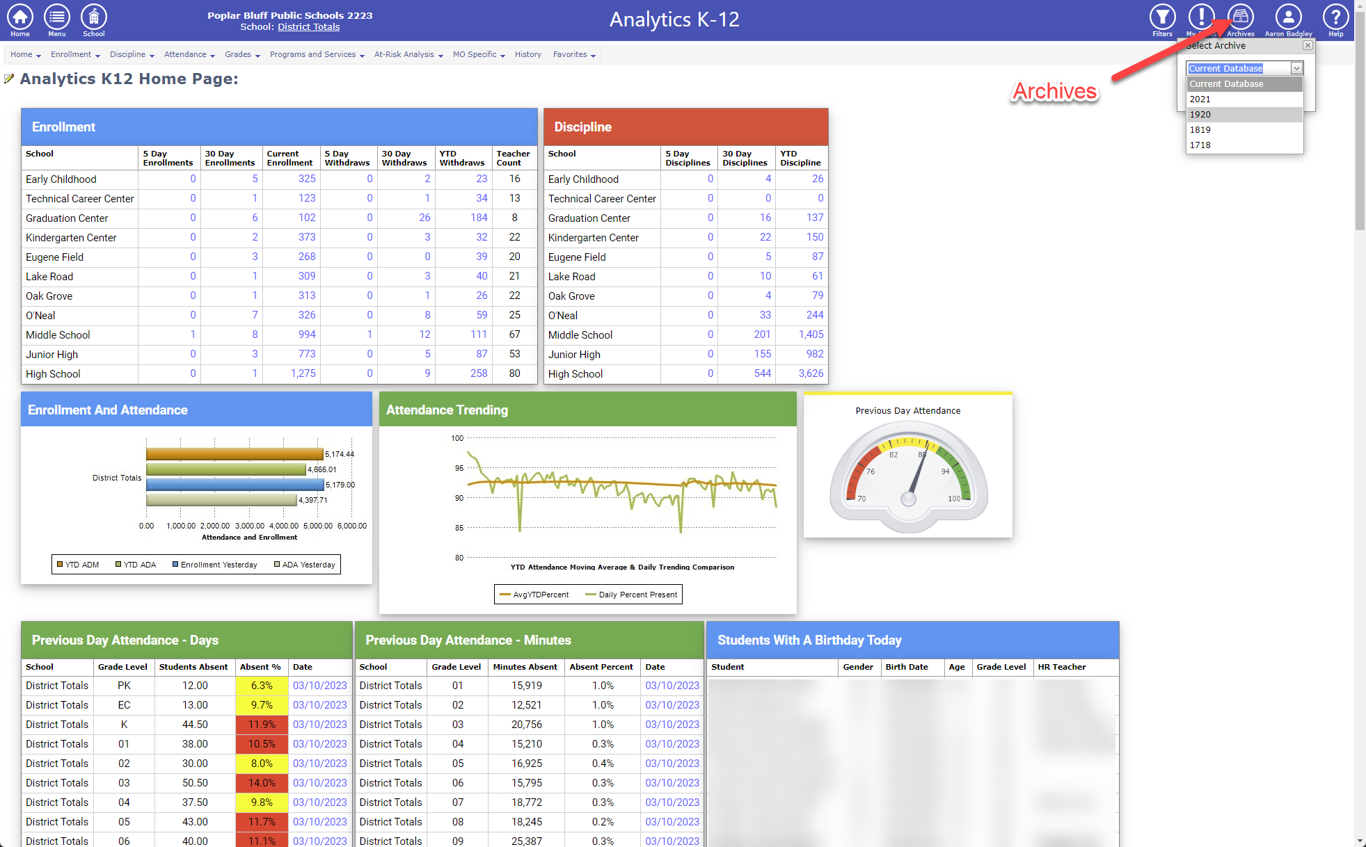 K-12 Analytics allows you to switch to historical data using the Archives link in the top right menu. Click the Archives menu and select the database you want to view. Due to changes in how SIS processes some data, only a limited number of historical databases are still available.
