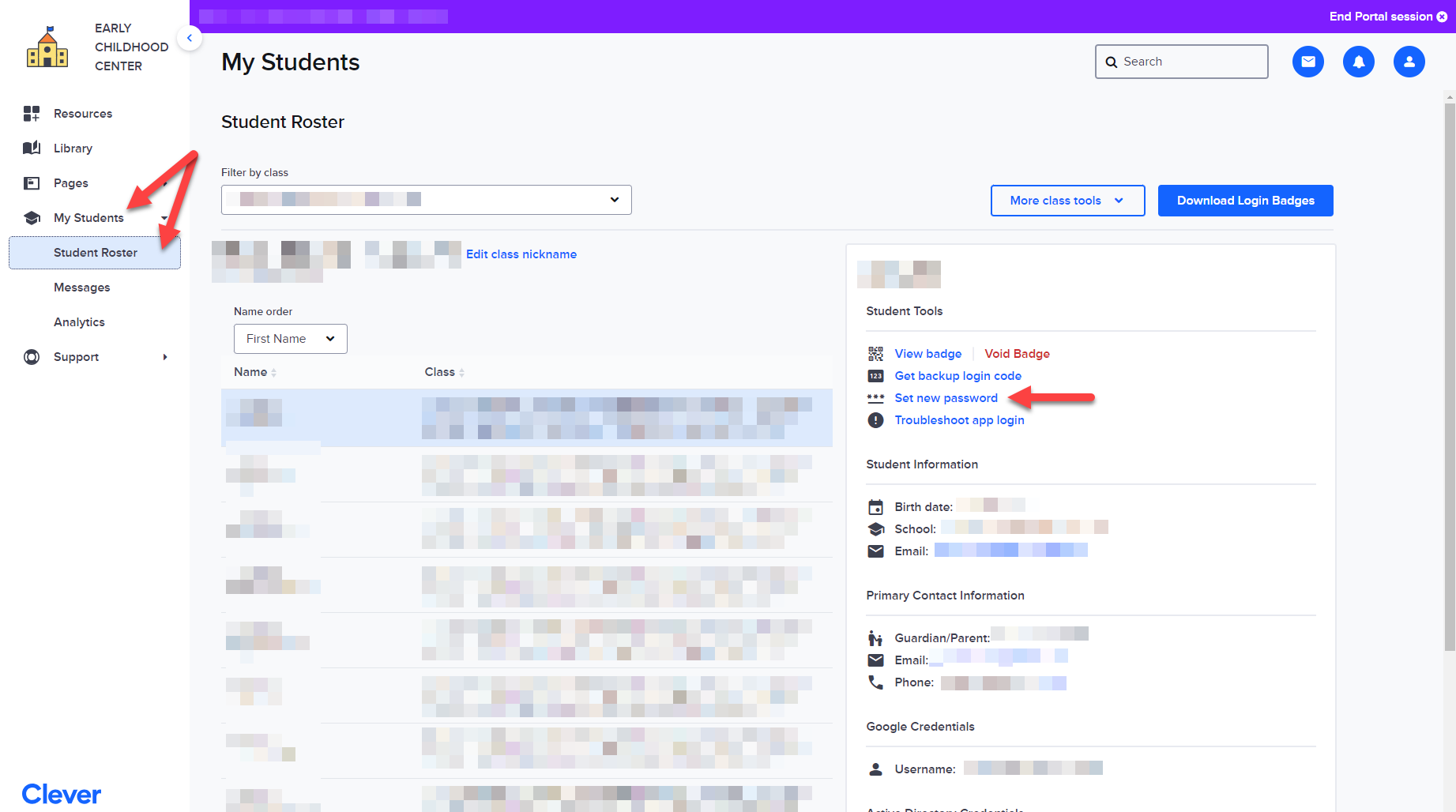 Next, select the student from the roster and on the right option panel, choose "Set new password" as highlighted above.