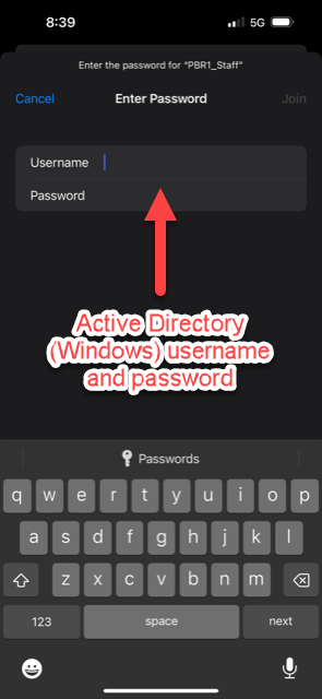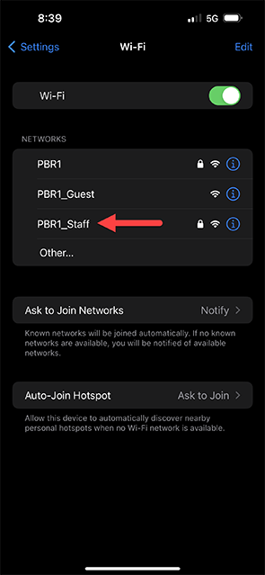 NOTE: If you ever change your Active Directory password, please note that your device will disconnect from PBR1_Staff and you must log in with your new credentials.